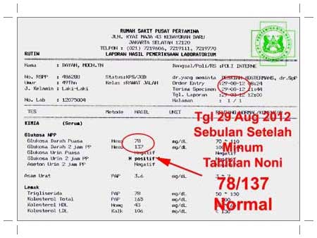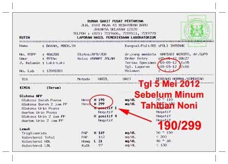 Sebelum menjalani terapi tersebut, kadar gula darah Pak Dayan selalu tinggi. Apalagi setelah hari raya, kadar gula darahnya selalu melonjak, dikarenakan konsumsi penganan hari raya yang serba karbohidrat dan manis. Berikut ini hasil tes lab gula darah yang dilakukannya sebelum mengkonsumsi Tahitian Noni.