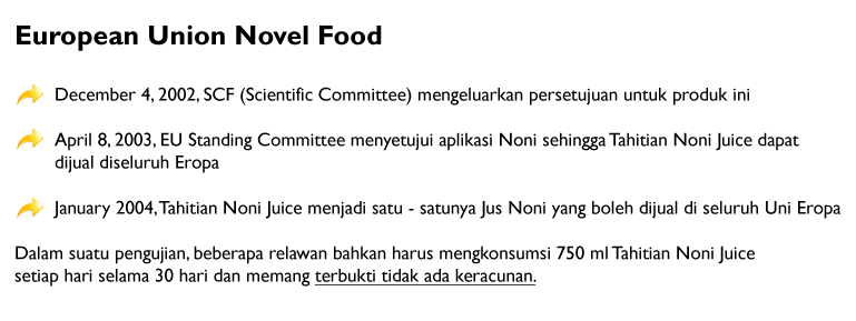 Tahitian Noni telah direkomendasikan penggunaannya sebagai terapi pemulihan untuk mengatasi berbagai penyakit oleh Uni Eropa dan menjadi satu satunya produk dengan bahan dasar Noni yang mendapatkan rekomendasi tersebut.