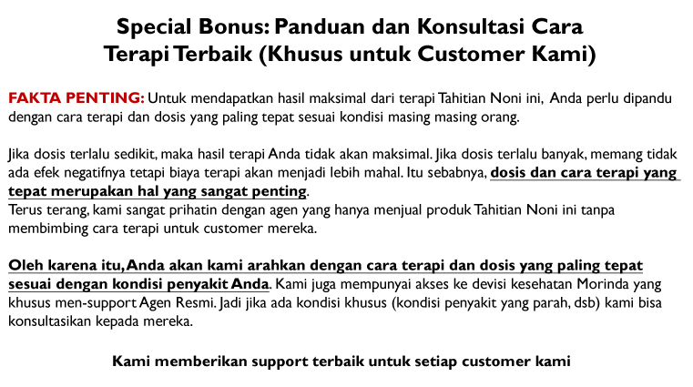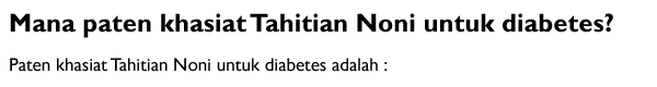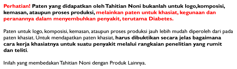 Tidak semua produk Noni itu sama. Saat ini sedikitnya ada 350 merek Noni Juice dari 150 perusahaan di dunia yang tidak direkomendasikan penggunaannya oleh Uni Eropa dan WHO. Produk Tahitian Noni Juice yang kami tawarkan merupakan obat herbal diabetes TERBAIK yang telah teruji khasiatnya secara klinis.