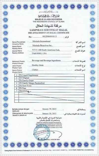 Tahitian Noni merupakan produk HALAL yang sudah mendapat persetujuan dari Badan Administrasi Halal Amerika Serikat. Sertifikat halal yang diperoleh obat herbal diabetes tersebut berlaku secara internasional dan selalu diperbarui setiap tahunnya.
