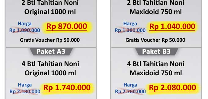 Selain itu, Tahitian Noni juga terbukti secara klinis mampu meningkatkan kembali stamina yang menurun dan membunuh sel kanker aktif.